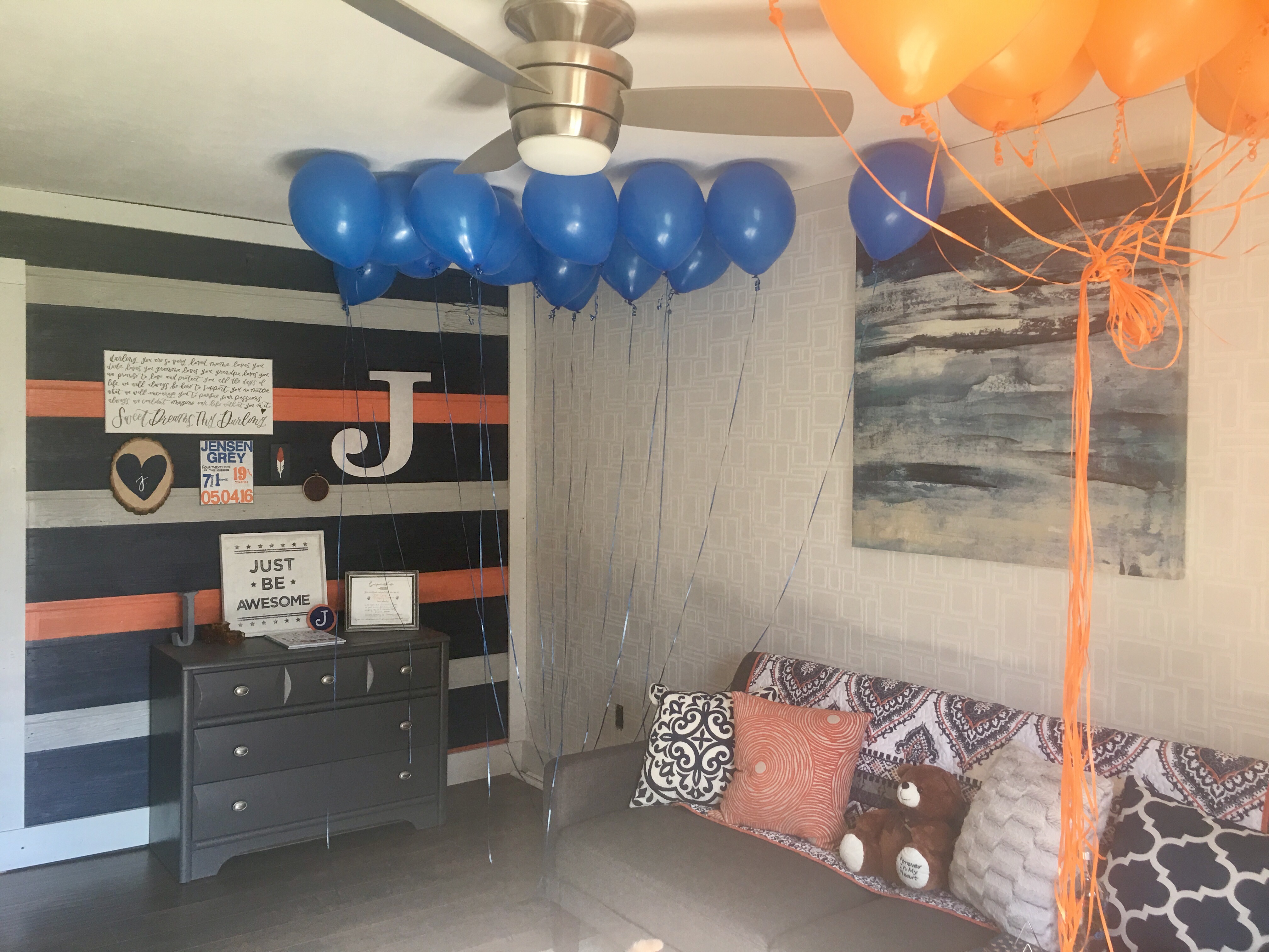 We then had an orange and blue balloon release. I wish I could tell you the sky was filled with Jensen’s colors, but the wind took them right into my tree. We watched as the escaped the tree and flew into the sky, eventually. I laughed at this. Of course the balloon release for Jensen’s party would get blocked by a tree. It is my life anyhow. These moments are light, where we can laugh and tell the little ones that the balloons are going to heaven so Jensen can play with them. When there were only seven left stuck in the tree, we went back inside for a special activity I had planned to honor Jensen and my support people.
