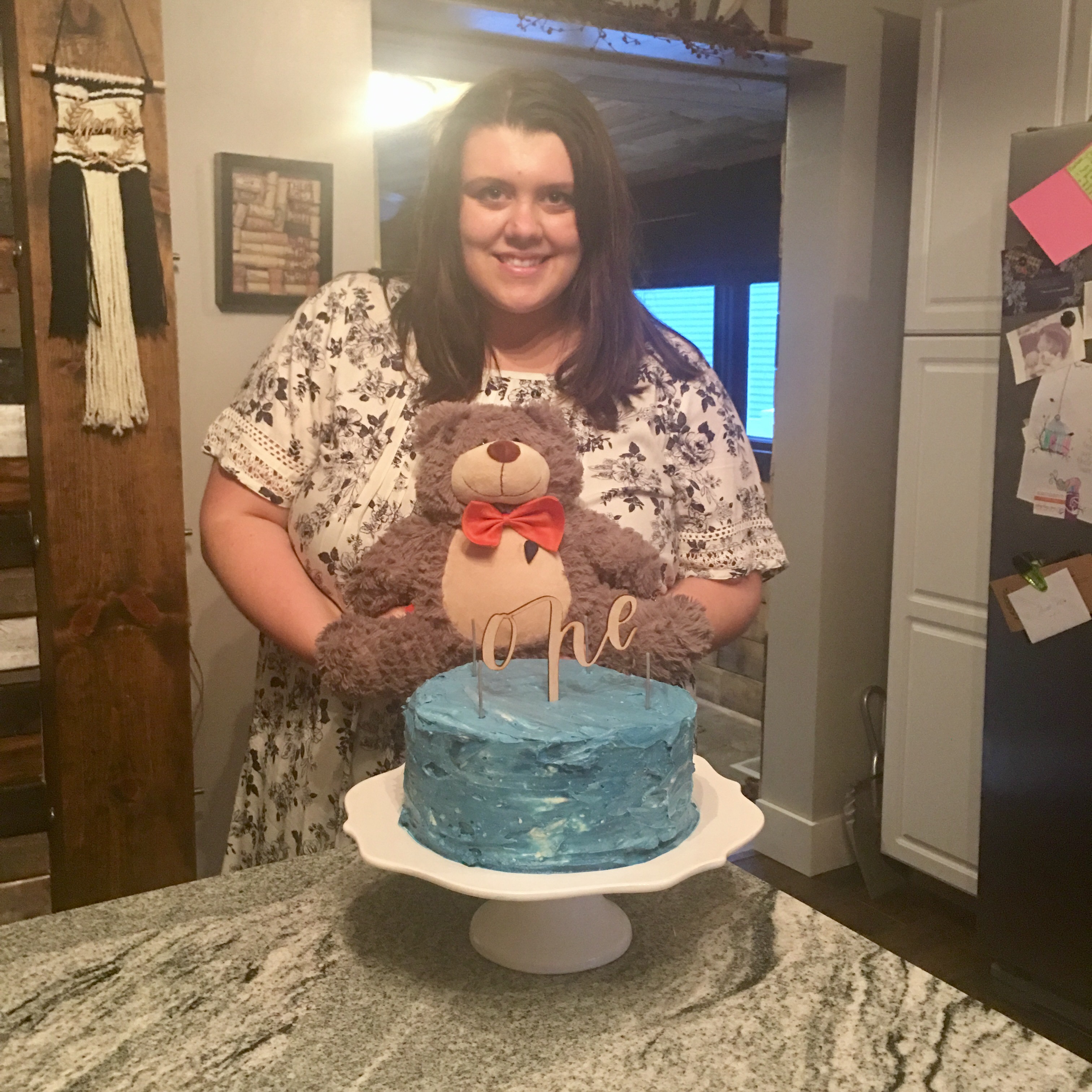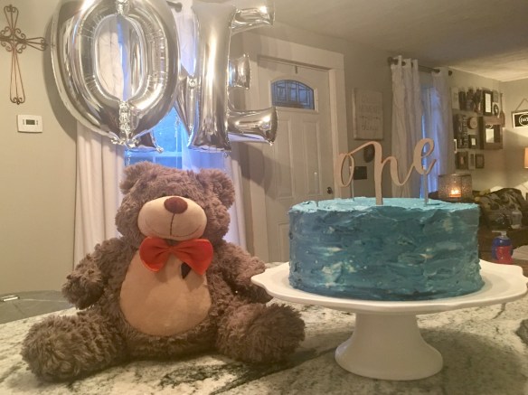 All of us were outside for a long while, until it was time to eat cake. This cake was handmade and iced with love and by me. It was the cake I dreamed of making him while I was pregnant. A three-tiered, blue cake. Of course with his cake topper and four silver sparkler candles. I took it to the island and everyone gathered around. All the lights were turned off and the candles were lit. This moment felt like it lasted an hour for me. I should be holding him or at least right behind him keeping him steady as he blew them out. The ‘one’ really set in for me. My baby’s one and I can’t ever bring him back. I think my brain could have been stuck in that moments forever, but it started.