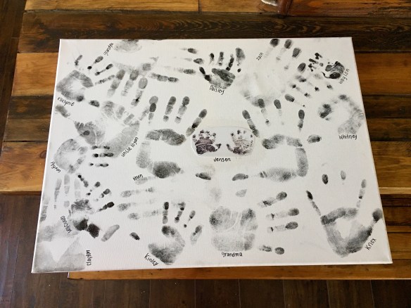 I wish I had a certain name for this project. Maybe something like, ‘In the Hands of Support’ or along those lines. Let me tell you, this was messy, but well worth it. I only need one more hand print on there for it to be complete, but it is one of my most prized possessions. All these handprints are my family and close friends. They have supported and loved me throughout this year in the best way they could. Even in the moments I resisted it, they never gave up on me or stopped talking about Jensen. I’m so thankful to always have a little piece of them, on his first birthday, forever.