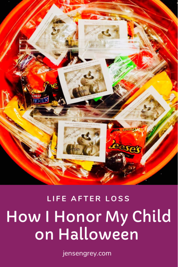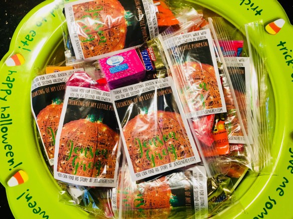 I had a graphic made with Jensen’s name on a pumpkin that said, ‘Happy Halloween to Heaven.’ Above and below the picture says thank you for letting Jensen walk with your child and to check his story out here. It was a great way to give back to neighborhood children while sharing Jensen’s story. I felt like this was a perfect option for me to be involved.