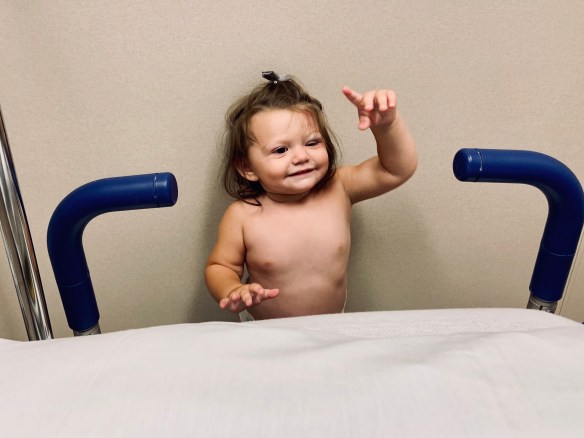 Again, I could finally get her calmed down enough and we stripped her down to her diaper. This made her happy of course, my little nudist. After throwing one more major fit when the nurse gave her Tylenol, she started playing and talking more. The same nurse who got to witness all the meltdowns gave Mila a stuffed, rainbow dog, which she LOVED. She played with the bed that reminded her of the lawn mower and reorganized some medical equipment I’m not sure she should have been playing with.