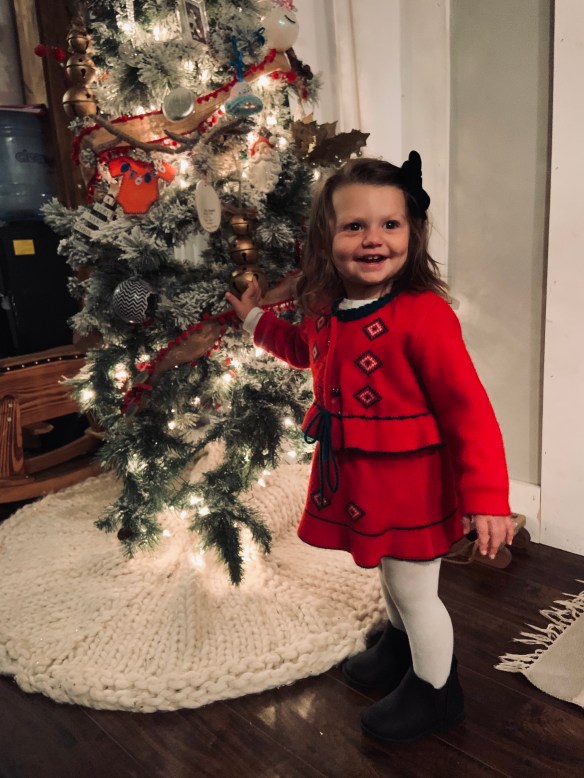 After a fun filled vacation to Aruba, I thought it’d be a perfect time for Mila and Santa to meet again. Mom and I found this outfit, which was my moms when she was a toddler, this fall and I knew Mila had to wear it for her Santa pictures. She loved strutting in her little outfit and gave us the weirdest look when we told her Gigi wore it at one point. That big smile lights up the room and I had hope she would flash it in front of Santa too.