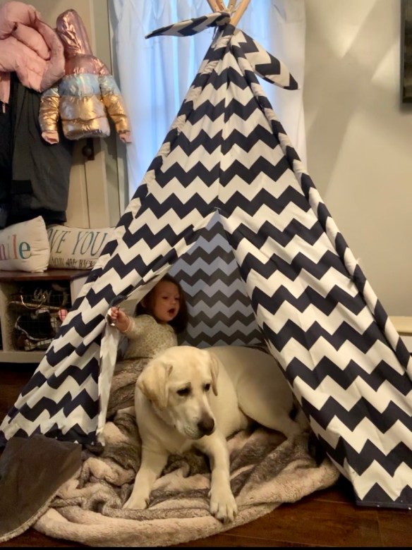 In the back of my mind, I’ve been thinking of Jensen’s teepee I got for him. It was supposed to go in the corner of his room for a little reading area. Since it never got to be put up, it’s been packed away in my basement. This morning, Mila was begging me to get under her little kiddie table and with her, the dog, and I, the table wasn’t cutting it. I decided to be strong and go in Jensen’s corner of the basement to get the teepee.