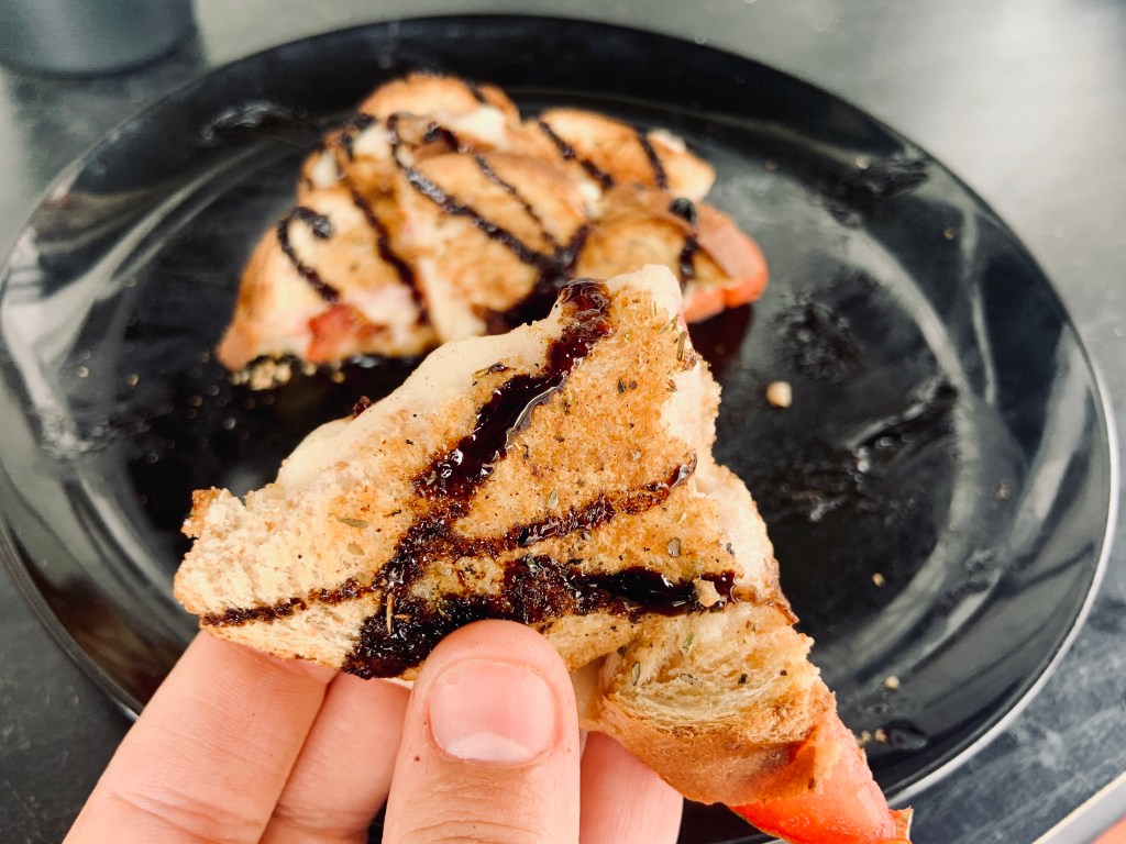 First things first heat up the pan you’re using while cutting up your mozzarella and tomatoes. I made two sandwiches and used two tomatoes and one ball of fresh mozzarella. Salt and pepper the tomato and cheese for extra taste. Butter one side of each piece of bread (normal with any grilled cheese, obviously right?). To elevate this sandwich, put Italian seasoning on the butter side. That way the flavor sticks to the bread and butter. It just seeps into the bread and might be one of the best parts. Place your bread, butter side down on your pan, and layer your cheese and tomatoes too. I did like three little layers: mozzarella, tomato, mozzarella. It stacked up a little high, but after the first flip, I smashed it down a little bit to make it more manageable. At this point, I did think there might be a melting issue, so I turned my oven on 350 F and took out a baking sheet. After the other piece of bread was grilled, I personally didn’t think my cheese was melted enough, so I popped it into the oven for about five minutes until I thought it was melted to my liking. This is a total preference though, but I felt like it made my sandwich way better. After, I diagonally cut my sandwich and drizzled balsamic vinegar over it.