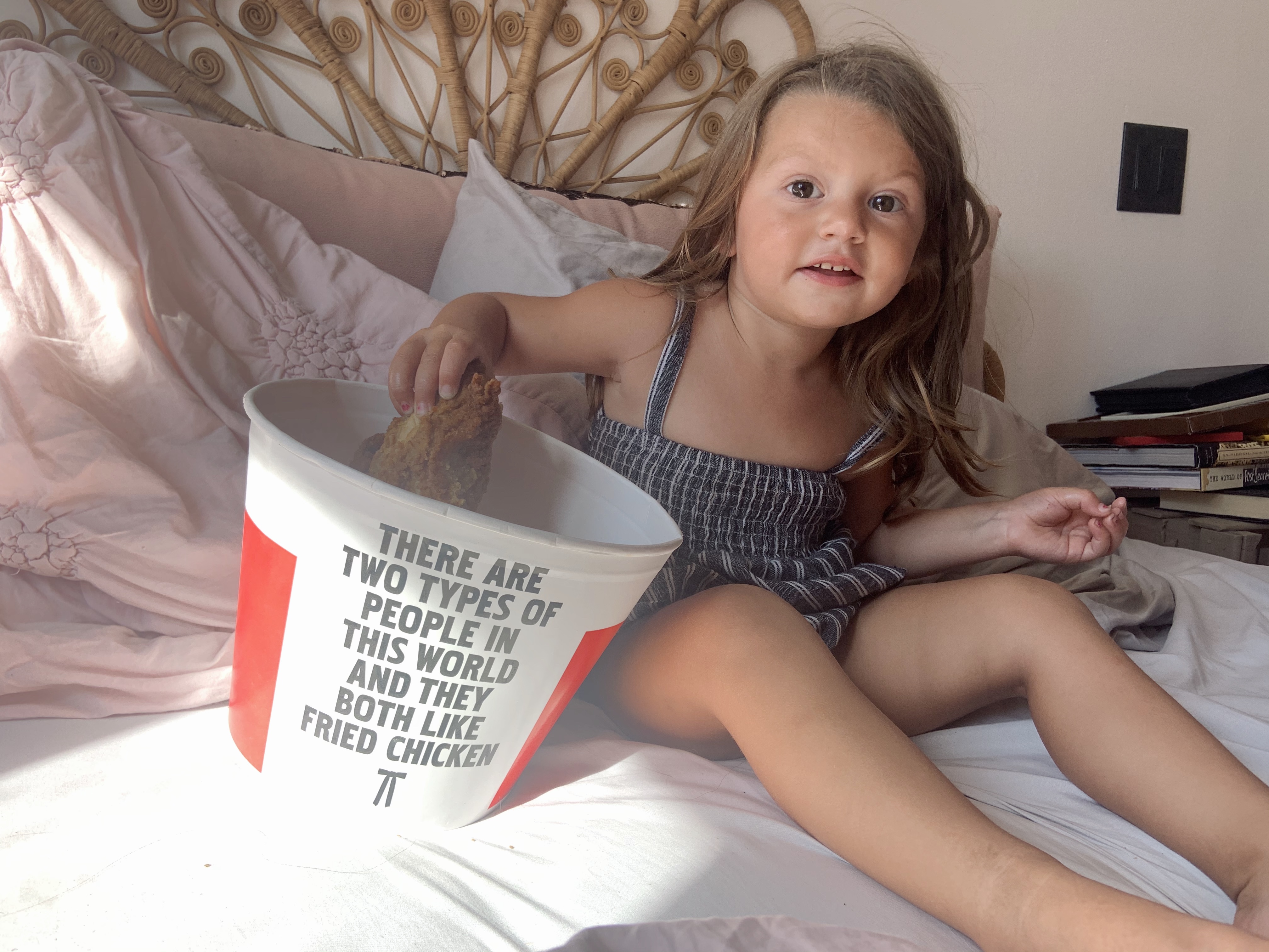 This girl brought a whole bucket of chicken to bed to eat. Not your usual morning snack, right?