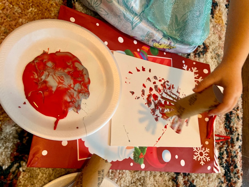 Then, we put our paint on paper plates. Mila poured the red, which might have been a mistake. One recommendation is to spread the paint around. This way when your child pushes down with their brushes, all the bristles get paint on it.