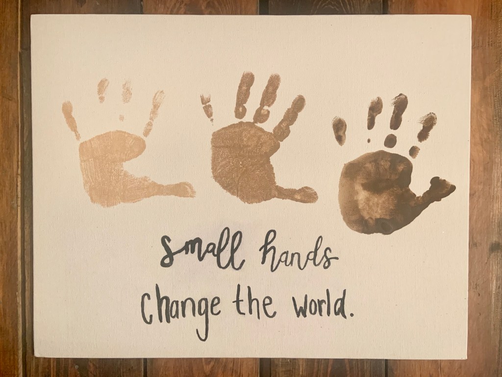 After her handprints, or she calls them paw prints, dried, it’s time for the words. I ended up painting the phrase, “small hands change the world.’
