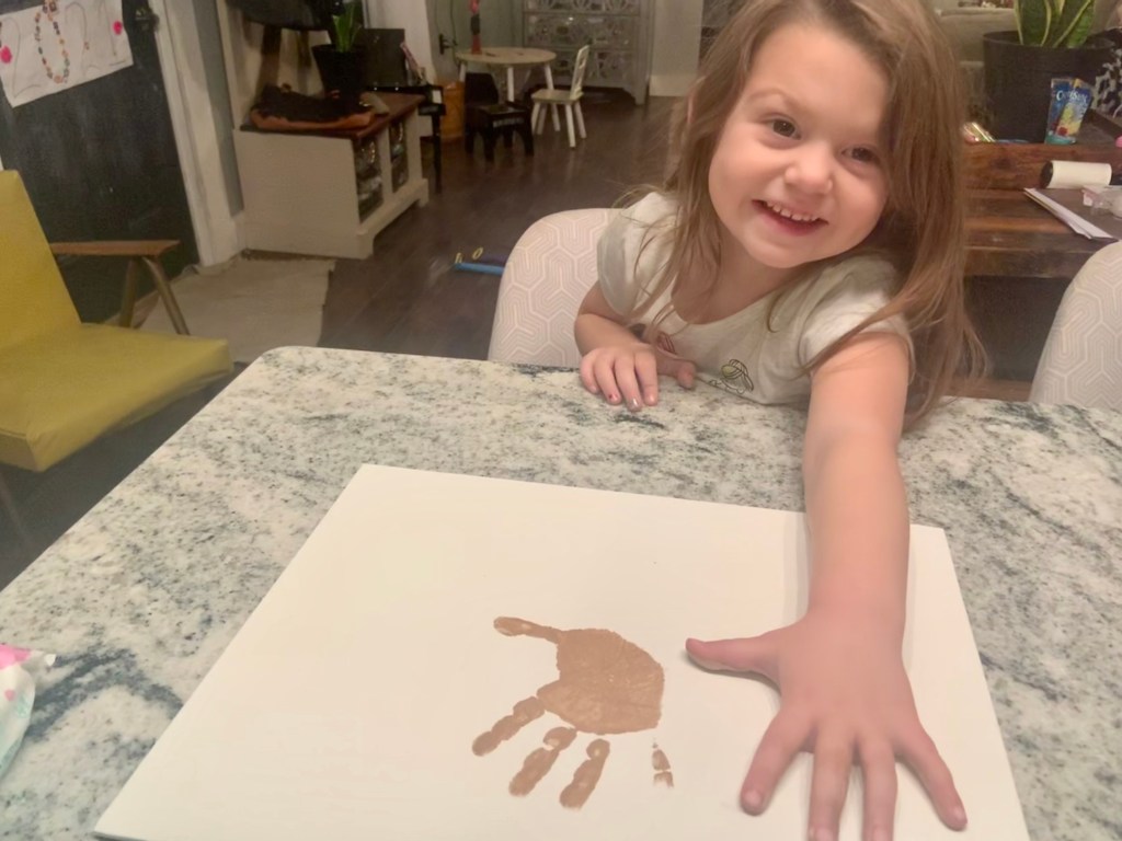 I took a paint brush and painted her hand. Then we pressed it on the canvas. When pressing their hands down, make sure to get all of their fingers too. If not, it’ll be really faint. Finally, I cleaned her hand off and did the process two more times.