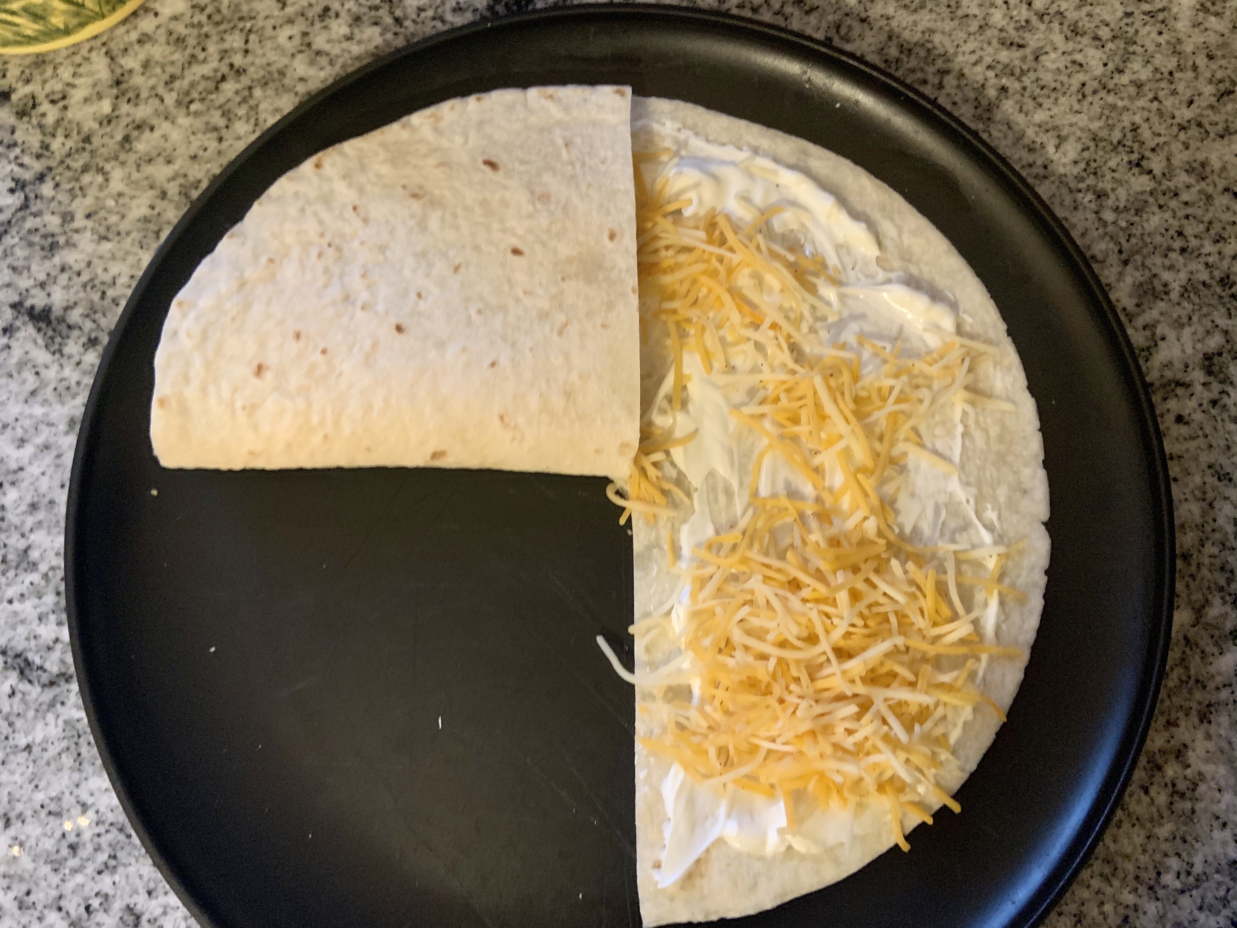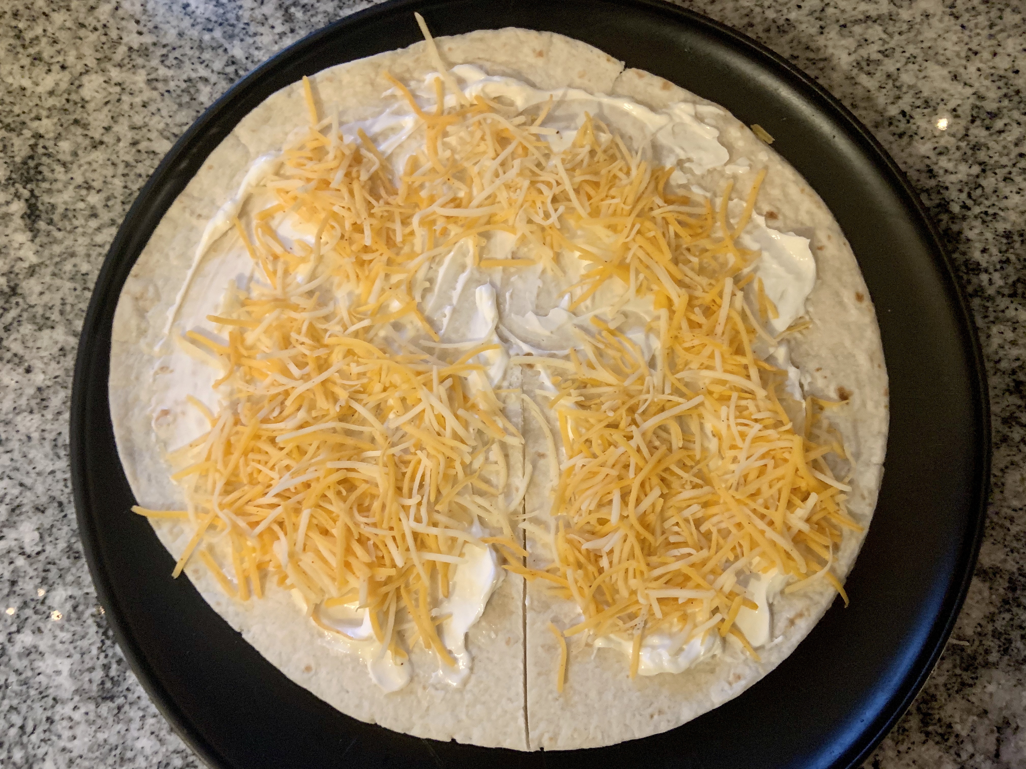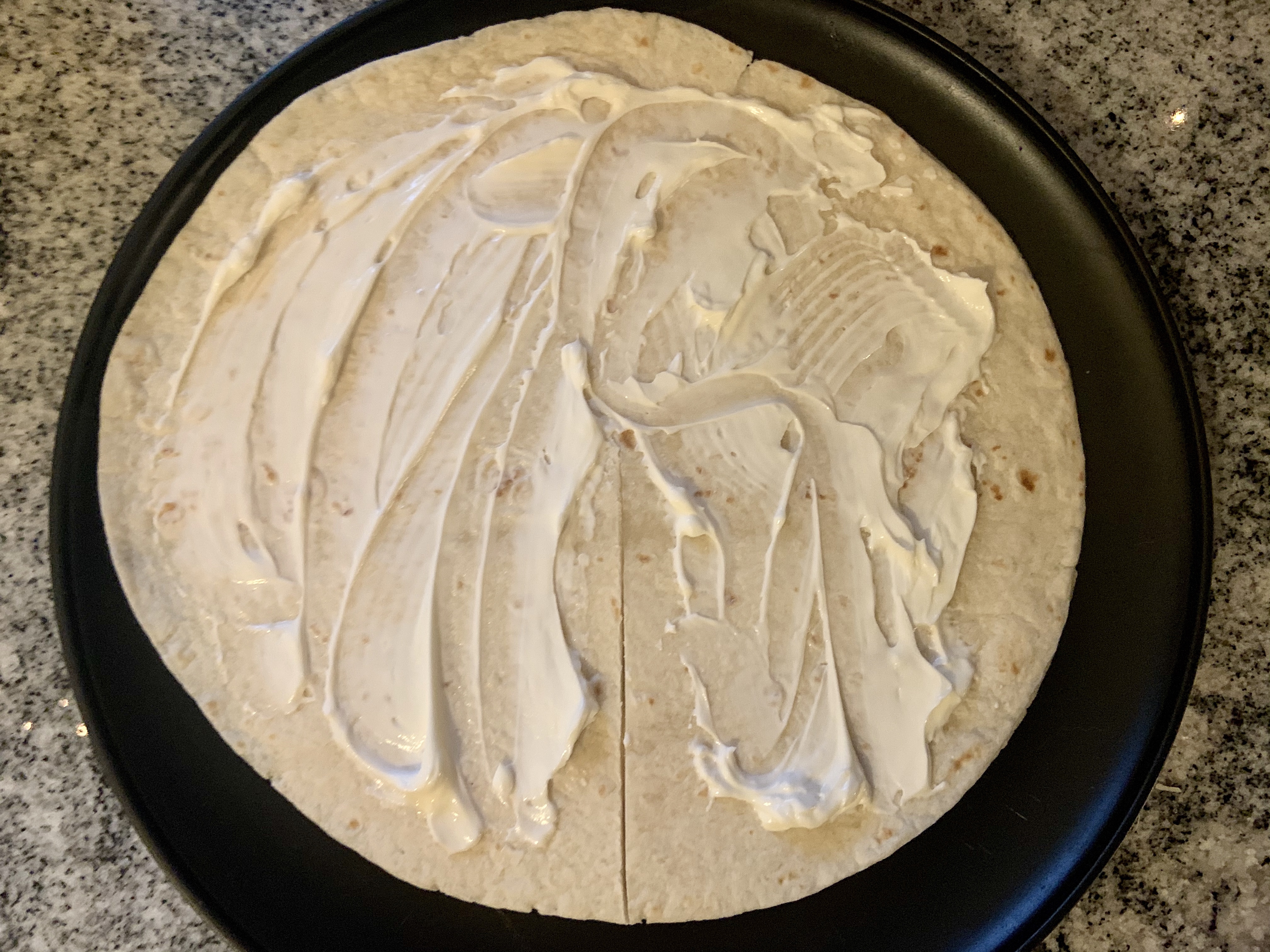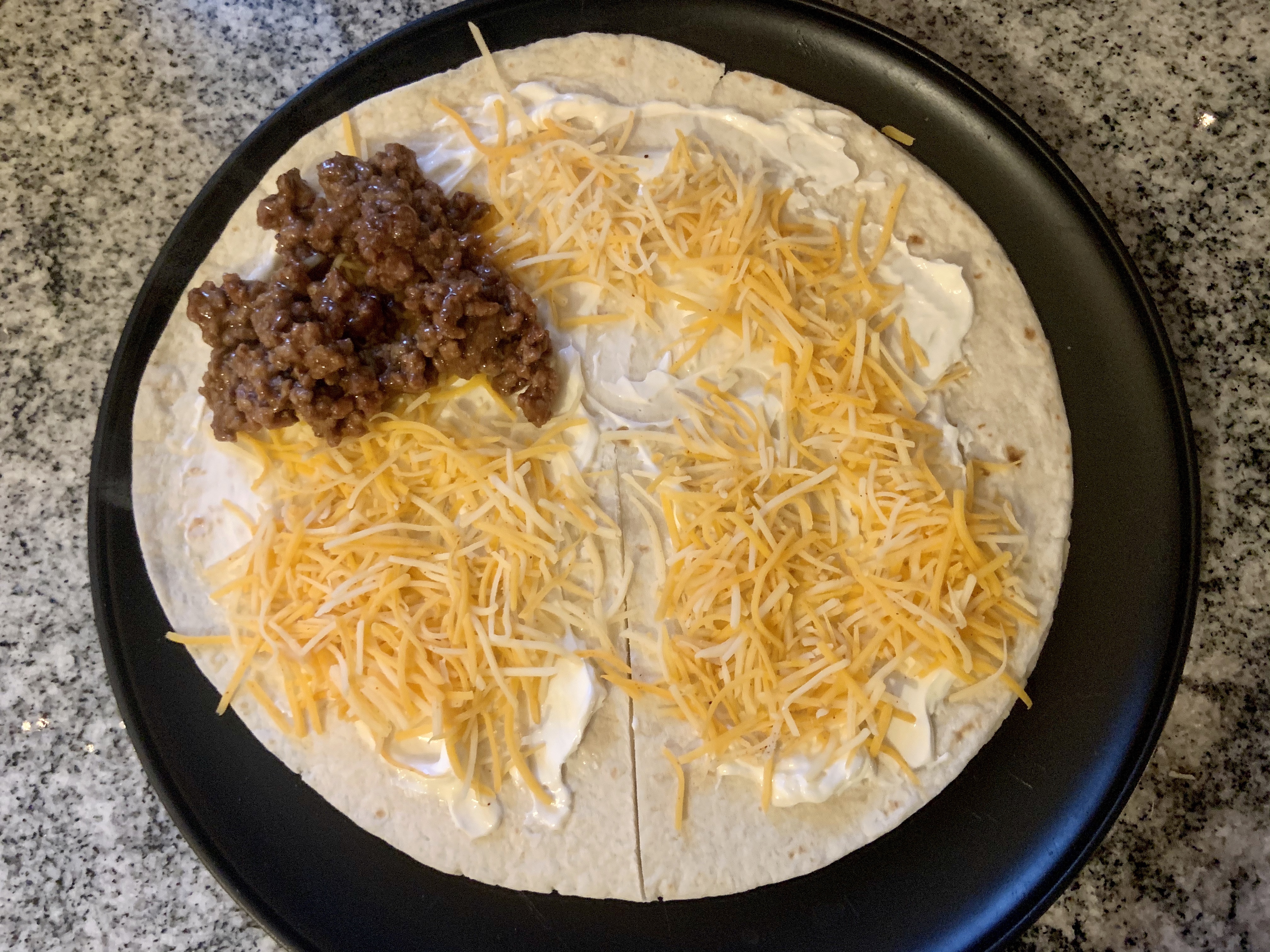 Simply, make a cut, spread sour cream, add cheese and meat, then fold. It’s pretty simple. I added extra cheese to the non-meat portions.