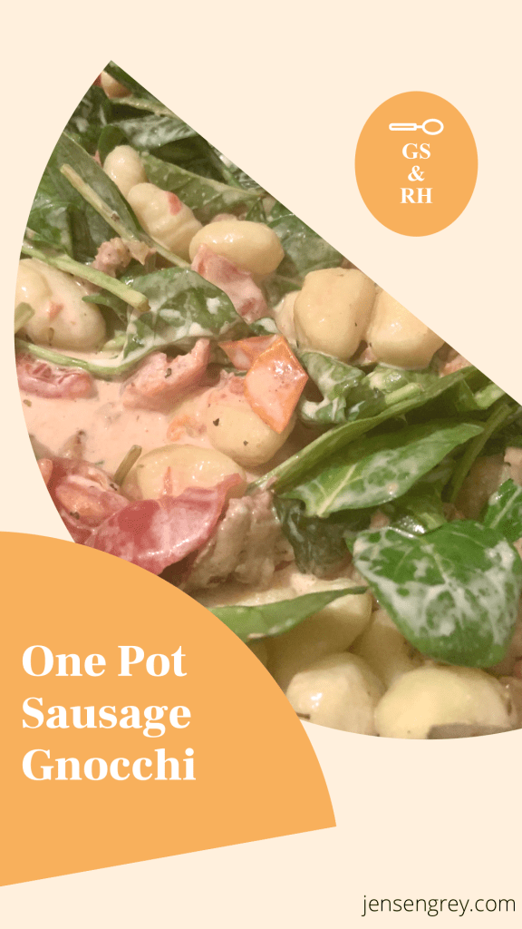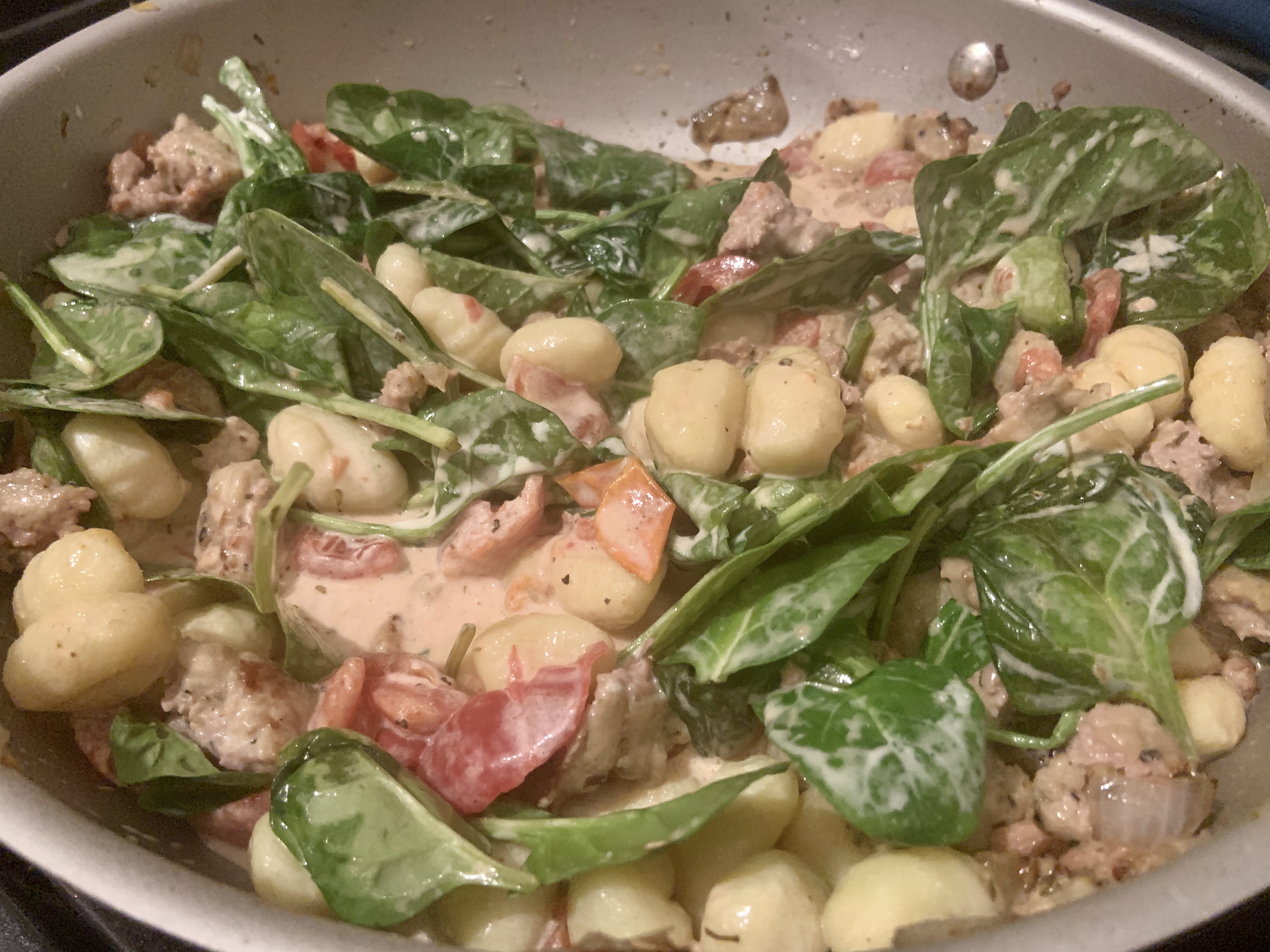 After, add in the tomatoes, cream, gnocchi, and spinach. Keep cooking until the gnocchi is done, spinach is wilted, the sauce has reduced.