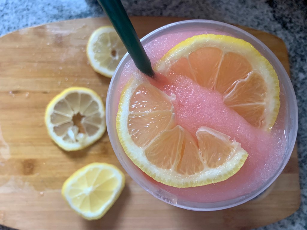 Mix them all until they’re the consistency of a slushee. For extra tartness, I put lemon slices around the glass and to garnish.