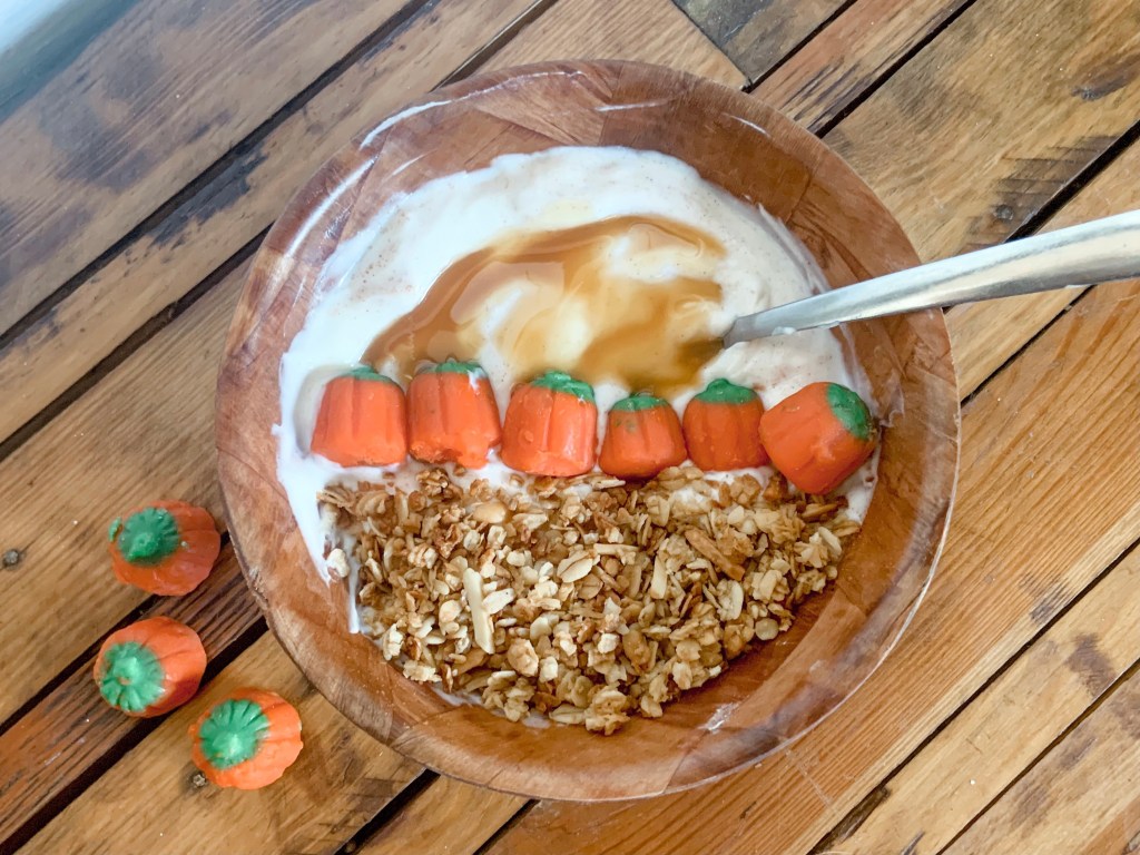 Next, line up a few candy pumpkins between the granola and yogurt. I’m not a huge fan of these, but mixed with the yogurt and granola, I enjoyed it. Again, it also made the bowl super cute too.
