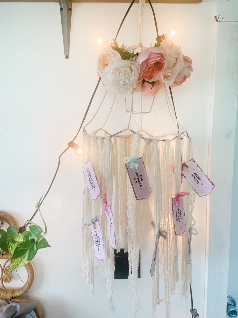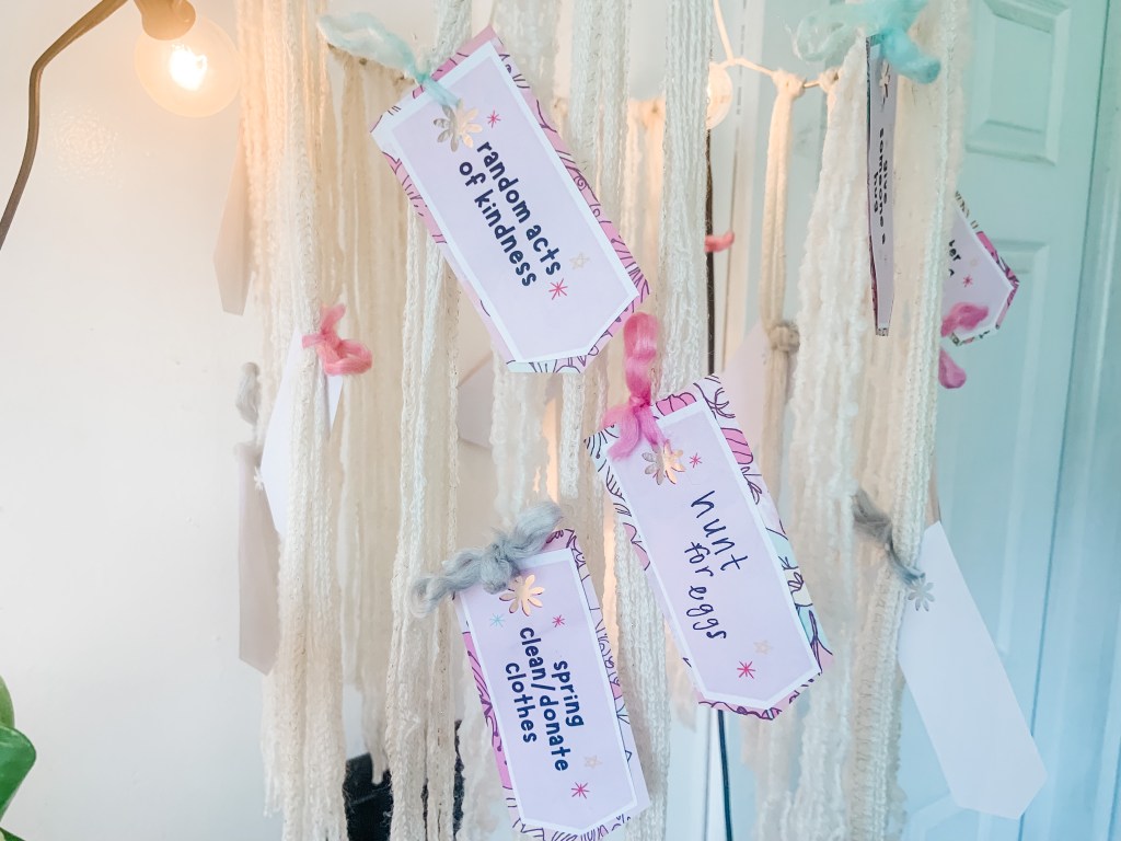All you have to do is a light tie on a piece of the yarn or ribbon on your wall hanging. I just shuffled them around so we could easily see them.