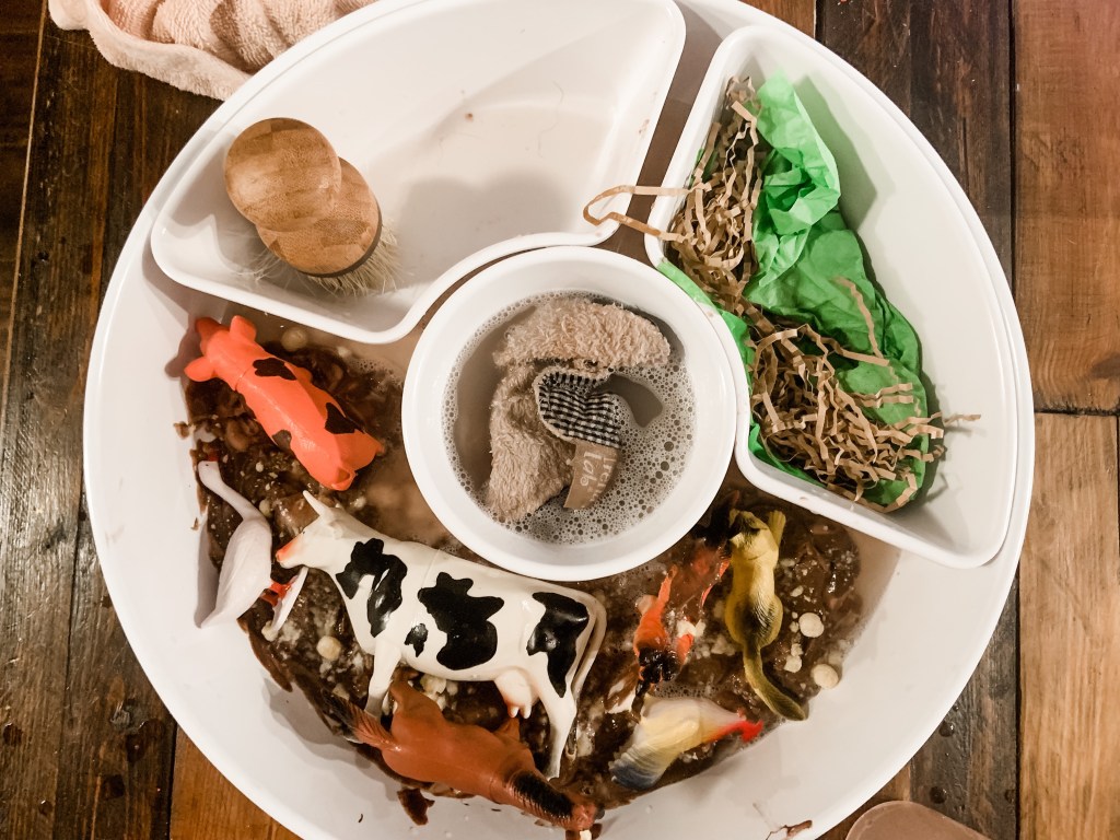 What’s Mila’s favorite part about spring, minus the flowers and nice weather? All the baby animals! This Farm Clean Up Sensory Play idea is a perfect way to talk about new baby animals AND have fun being messy too.