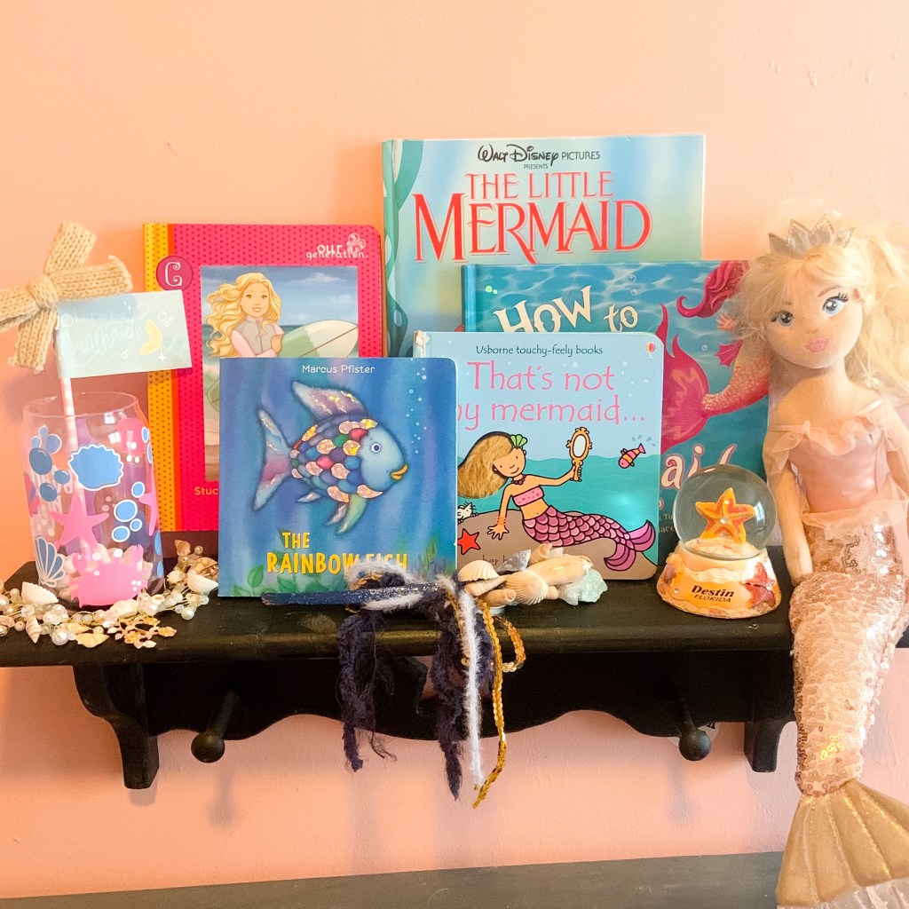 I laid out ‘summer’ books that included zoos, weather, and other ocean animals. Of course, she was instantly drawn to the mermaid ones!