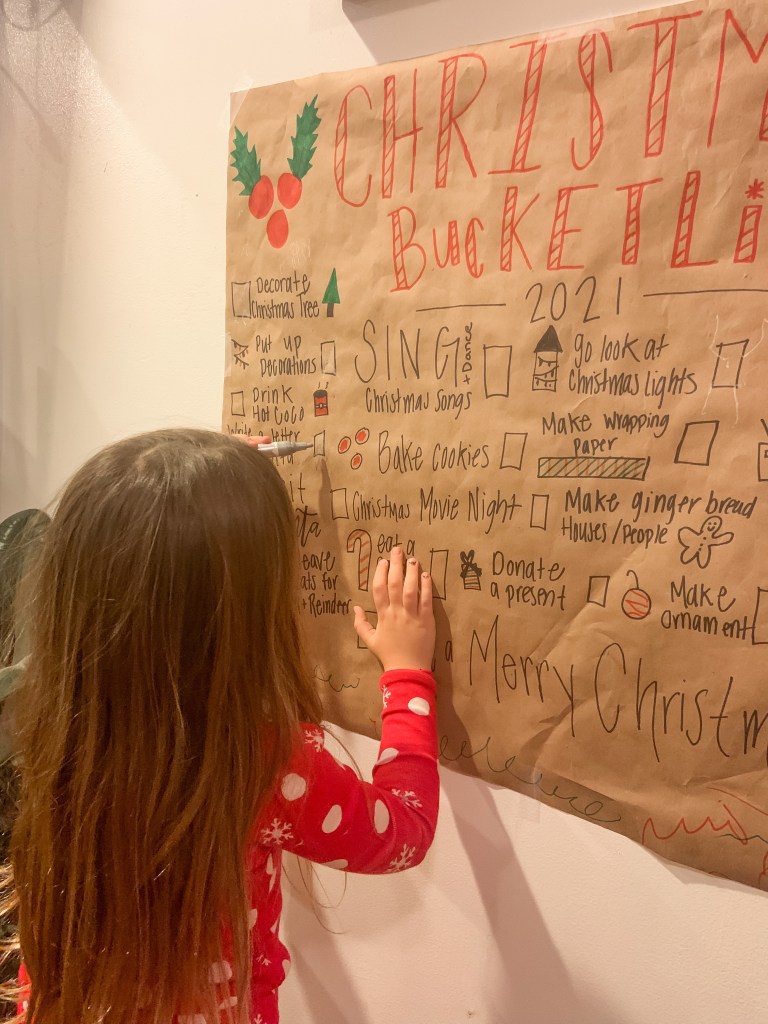 Making our own wrapping paper is a big Christmas Bucket List item for us. We did it her first Christmas and now it’s become a fun tradition. I know my parents always look forward to seeing her wrapping paper. This year, she made it for her friends at preschool. I’m sure we’ll be doing this Christmas Activity more than once this year.