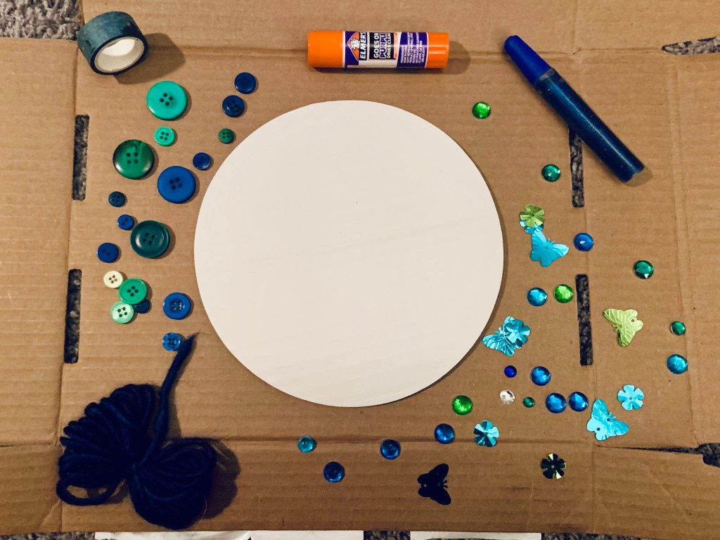 It came with: cardboard cut in a circle, blue and green paint, a packet of buttons, a packet of gems, a glue stick, string, washi tape, glitter glue, and a paint brush. A laminated picture of the world, along with directions, supply list, and information about the craft accompanied it as well.