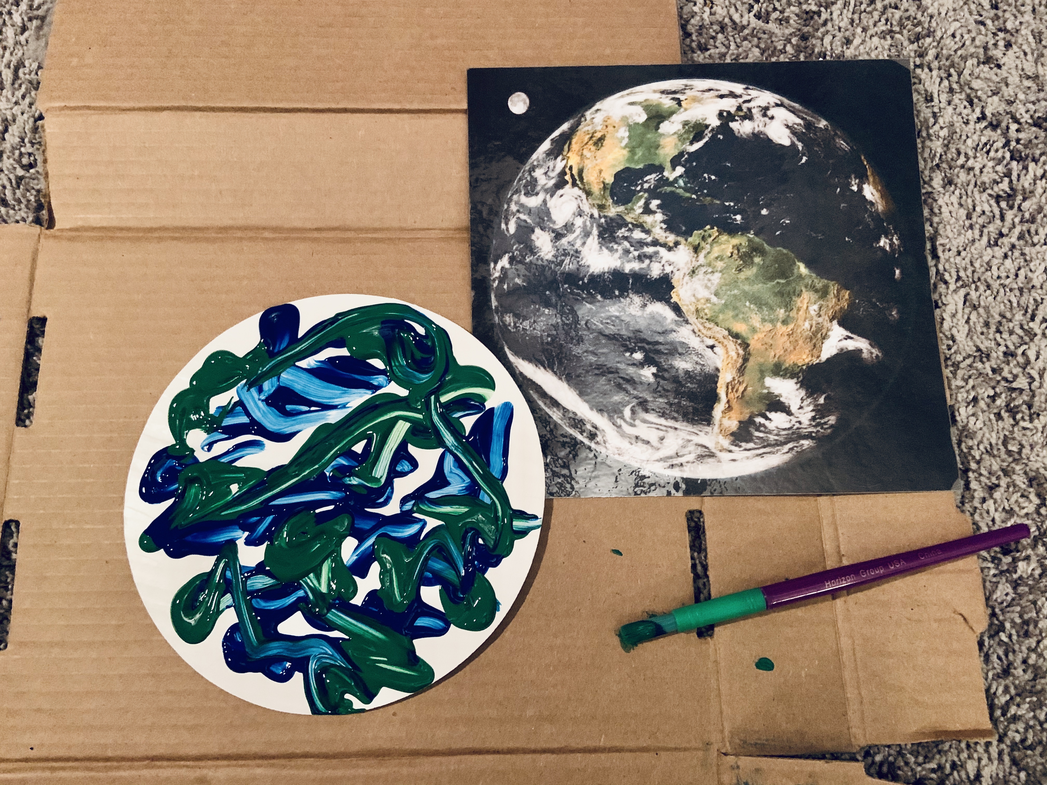 Next, paint your child’s hands resembling the Earth. This was a bit tricky. I just added blue paint first then topped it off with green. Obviously it’s not going to look exactly right, but I think ours turned out pretty cute.