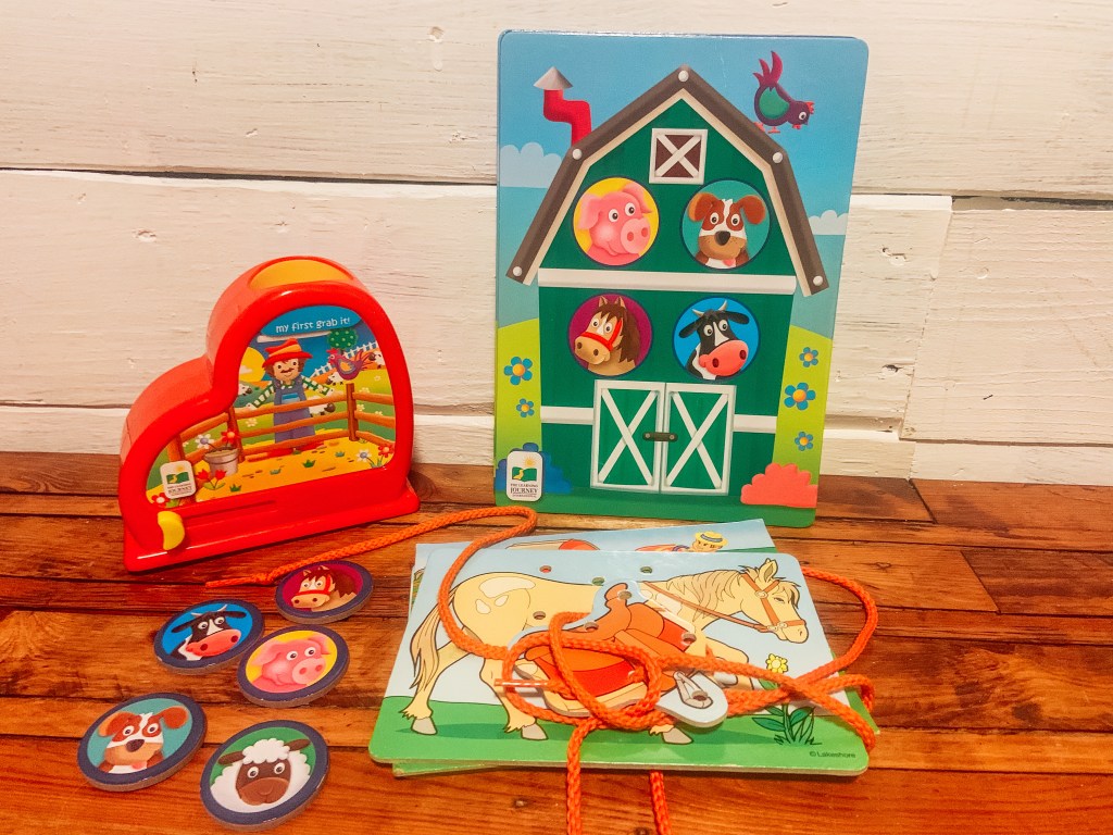 This game is so educational for us. Not only does it help with matching and animal recognition, it’s taught Mila to take turns and we practice animal sounds too. I found this game at Aldi, but you could make one too. Personally, I would use matching cards with farm animals and then have each player grab them from the deck. Essentially it would be the same thing.