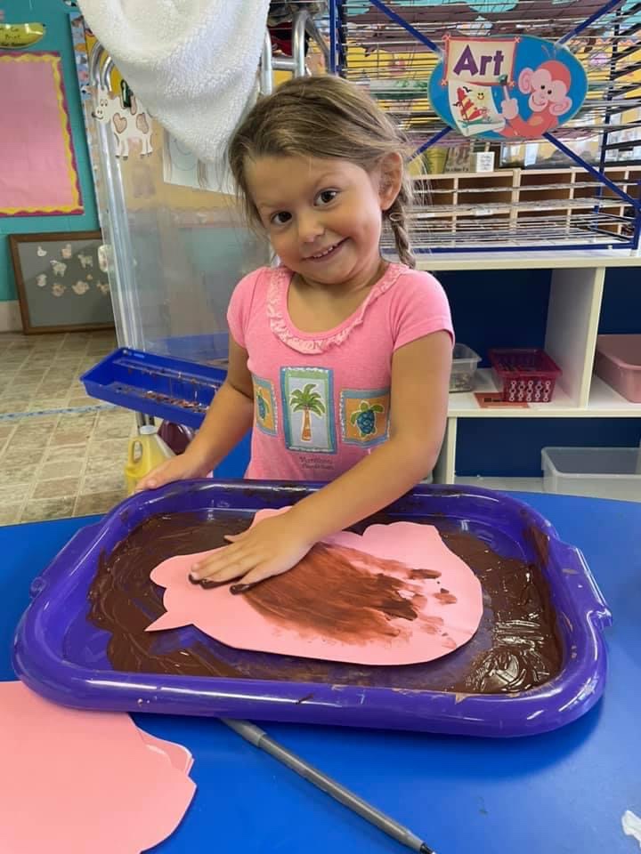 It’s a cut out of a big with brown paint. So, they got the pig dirty. I’m unsure what type of paint they used, but if I were to do this, I would probably put a drop of dish soap in the paint and mix it. This way it helps with clean up! Plus, what toddler doesn’t like getting dirty!