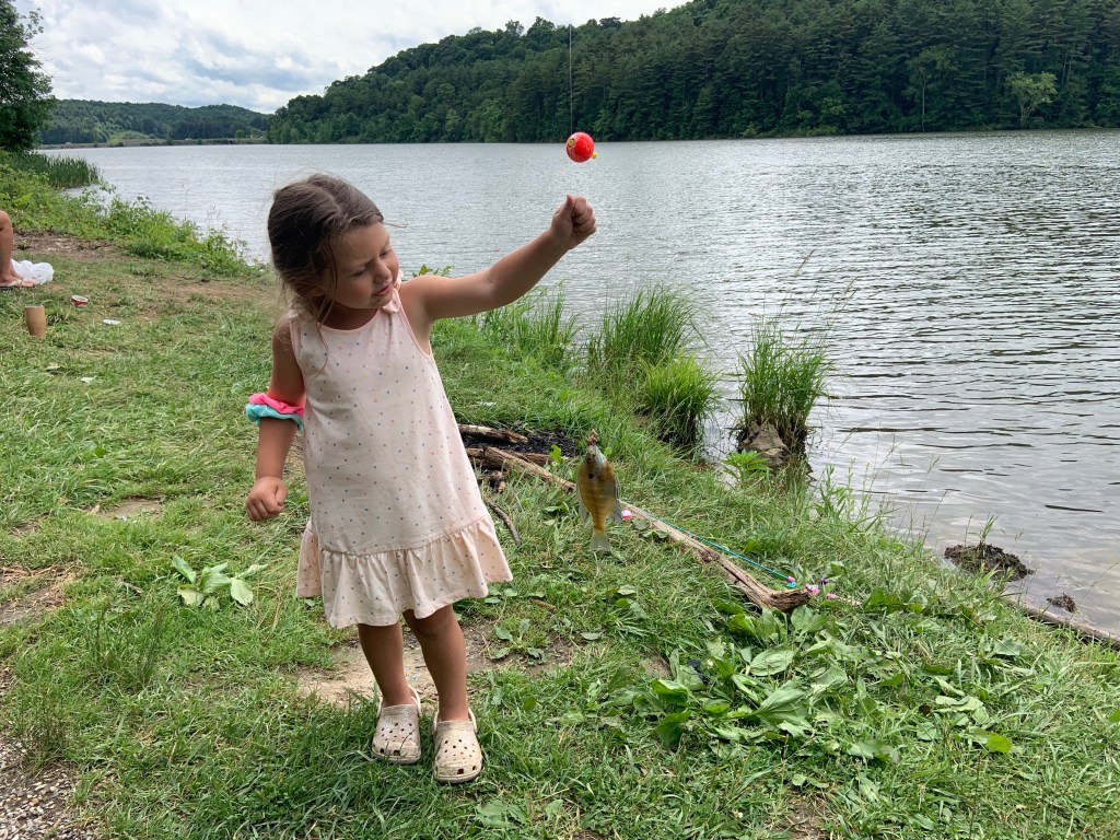 Cue the yelling to Mila to help me reel the fish in. As she ran over, I realized I probably scared the rest of the fish away, but this was a BIG moment for her.