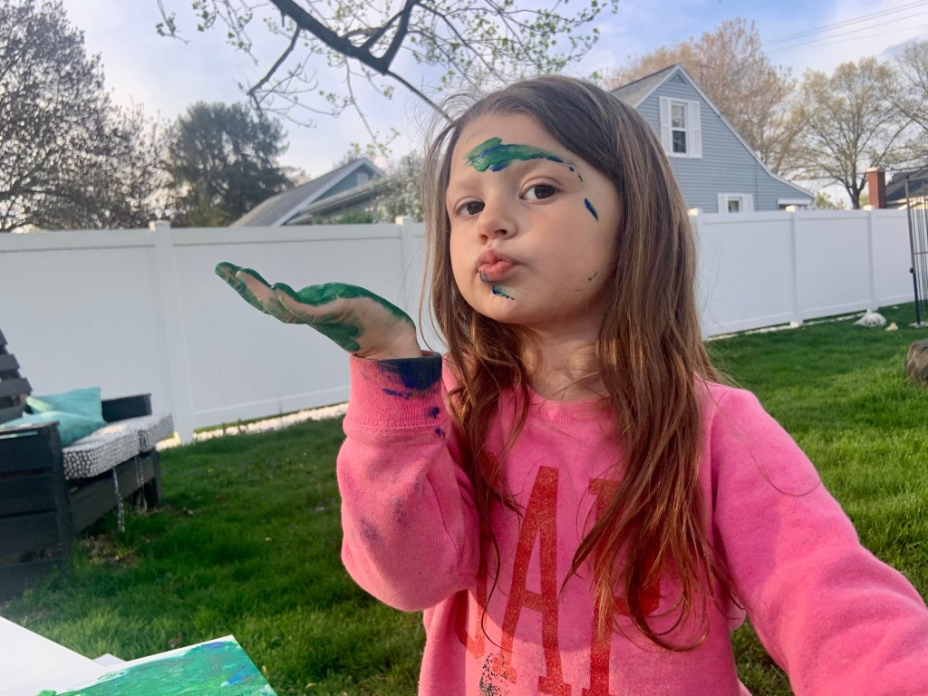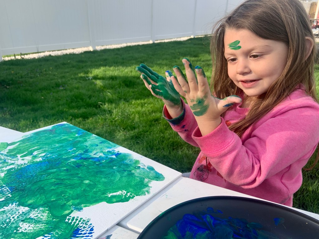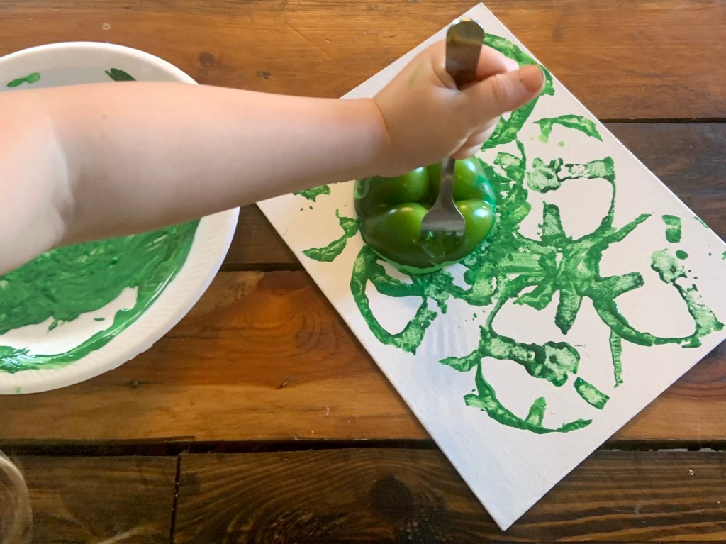 Next, I had her let me know what color paint she wanted to do. Another great way to practice her color recognition, which she has nailed! But, it’s always fun listening about her favorite color. I ended up putting all the colors on a plate.
