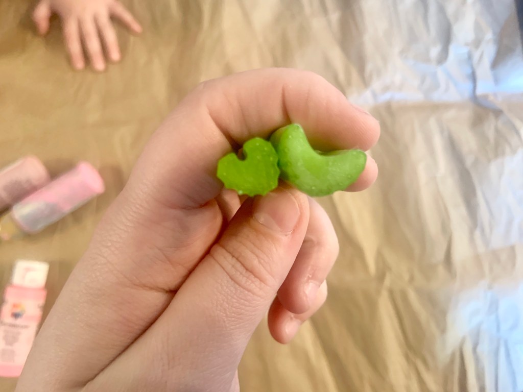 When the pipe cleaners are filled with cereal (or your child has snacked on the rest of it), all you need to do is twist the ends of the pipe cleaner together. Then, pinch where the two heart bumps would be at the top. I had to move the cereal around so I could do this and form it into the shape it needed.